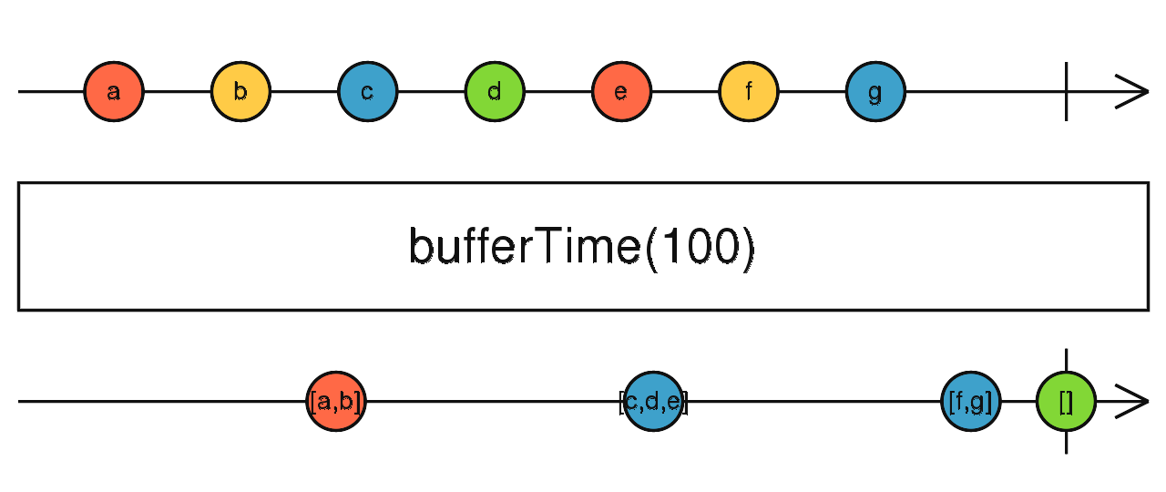 bufferTime(bufferTimeSpan: number, bufferCreationInterval: number, maxBufferSize: number, scheduler: Scheduler): Observable<T[]>