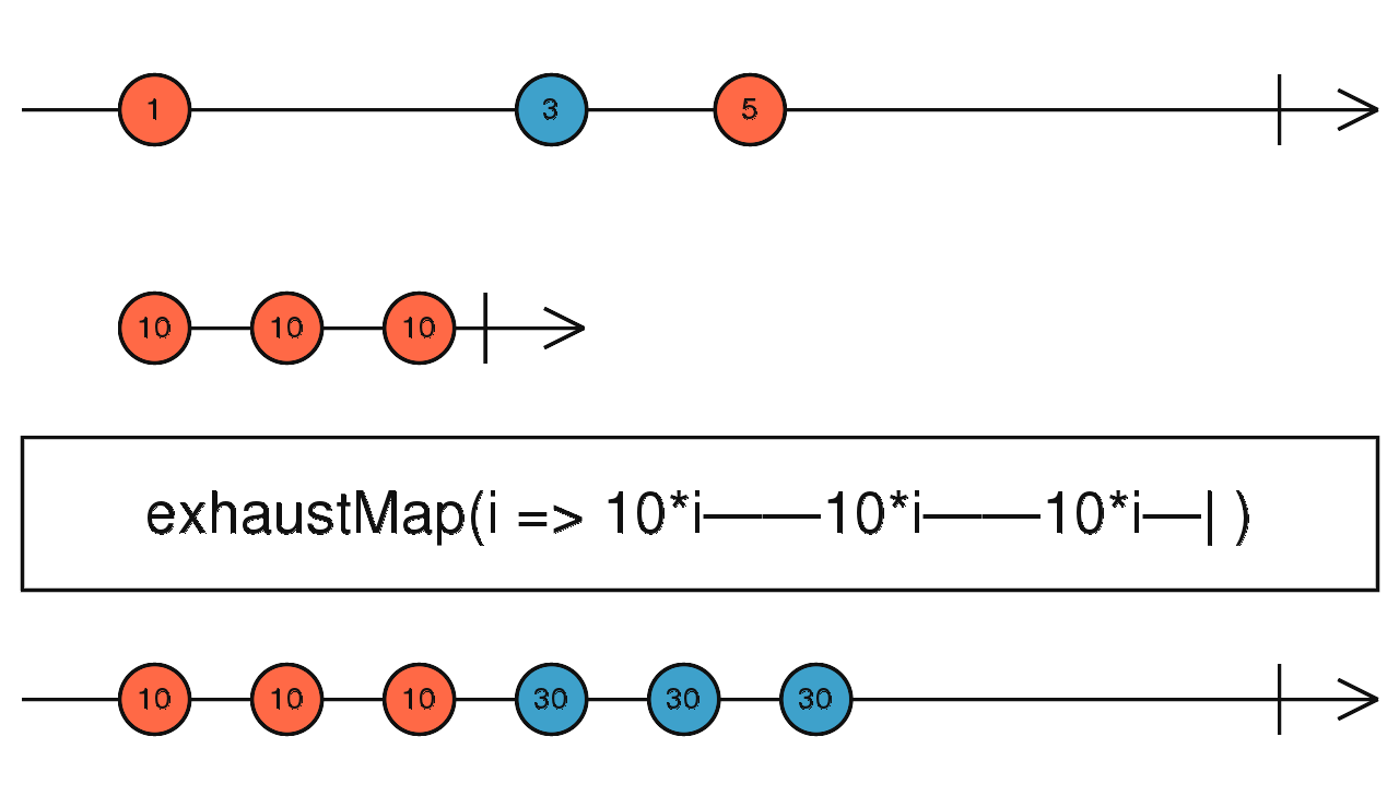 exhaustMap(project: function(value: T, ?index: number): ObservableInput, resultSelector: function(outerValue: T, innerValue: I, outerIndex: number, innerIndex: number): any): Observable