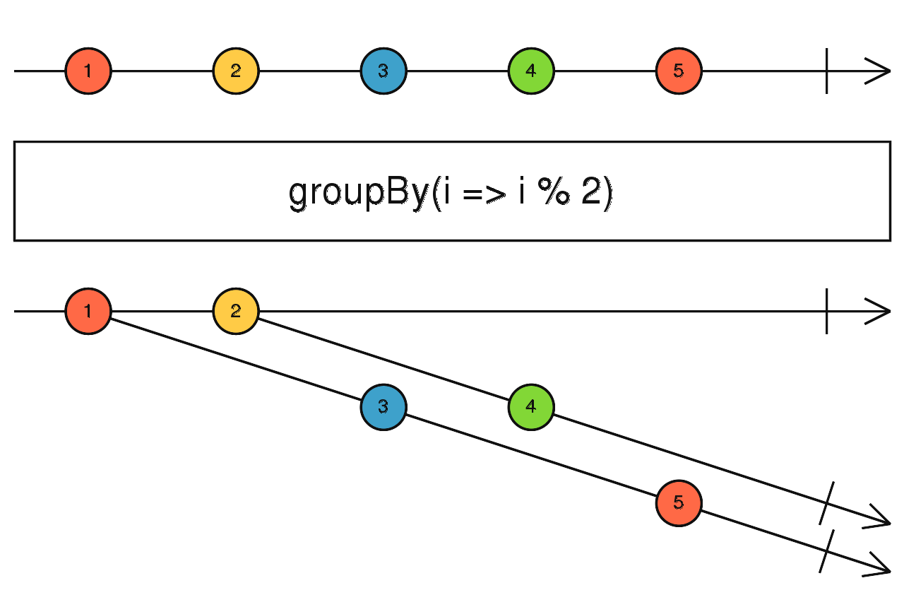 Observable.from(data).groupBy(x => x % 2, (ele)=> ele + '!').subscribe(g => {