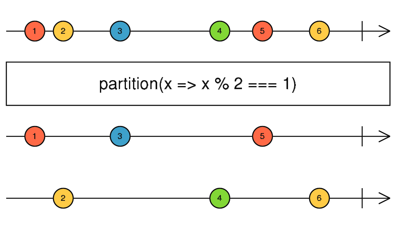partition(predicate: function(value: T, index: number): boolean, thisArg: any): [Observable<T>, Observable<T>]